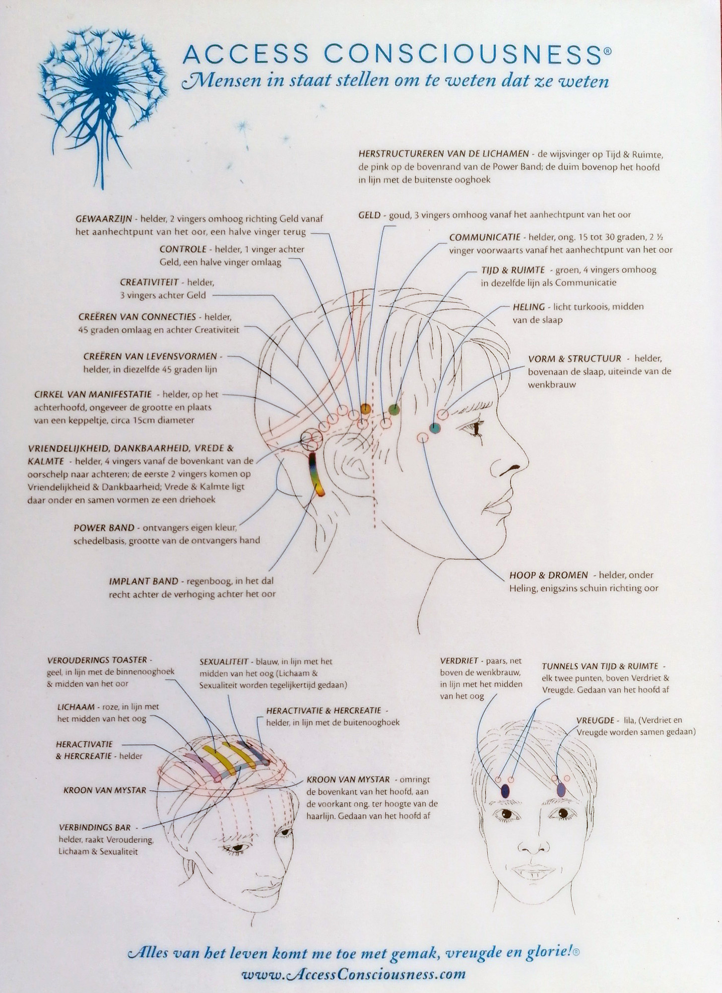 Access bars zijn 32 energetische punten en banen op het hoofd waarin allerlei beperkende gedachten , emoties , overtuigingen , oordelen , aannames en conclusies zijn opgeslagen .Elk van deze punten en banen staan voor een bepaald onderwerp en hebben toegang tot ons bewustzijn . Door deze op een bepaalde volgorde zachtjes aan te raken ontlaadt je de energie van deze beperkingen. Je krijgt zo ruimte voor bewustzijn , acceptatie en verandering. Er kan direct een verandering merkbaar zijn tot 3 weken na de behandeling.